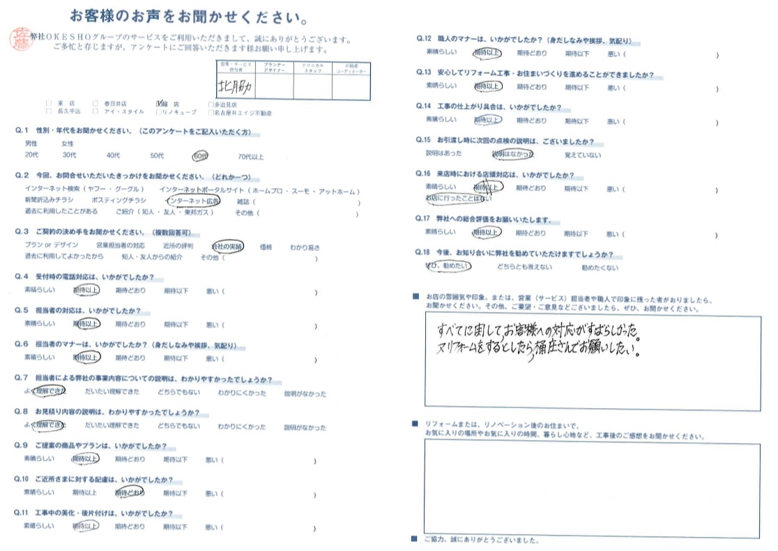 お店の雰囲気や印象。または、営業(サービス)担当者や職人で印象に残った者がおりましたら、お聞かせください。その他、ご要望・ご意見などございましたら、ぜひ、お聞かせください。