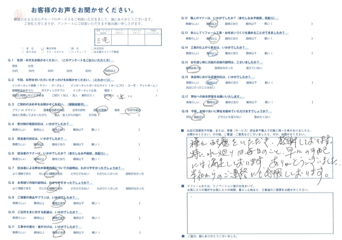 種々配慮をいただき、感謝しております。特に水廻りは毎日のこと、早々の手配には満足しております。ありがとうございました。本社からのご連絡にも感服しております。