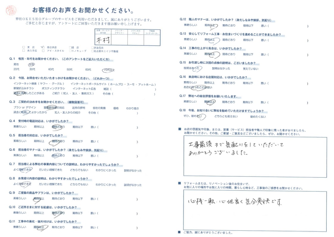 お店の雰囲気や印象。または、営業(サービス)担当者や職人で印象に残った者がおりましたら、お聞かせください。その他、ご要望・ご意見などございましたら、ぜひ、お聞かせください。