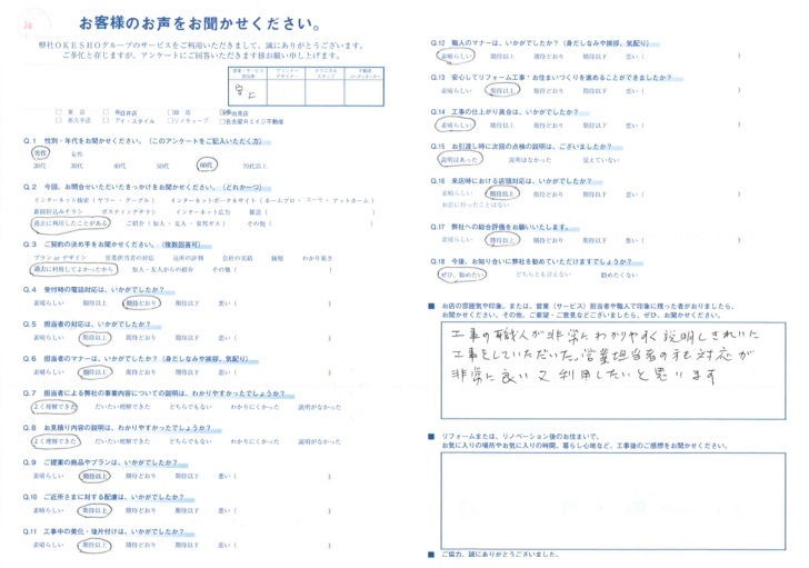 工事の職人が非常にわかりやすく説明し、きれいに工事をしていただいた。営業担当者の方も対応が非常に良い。又 利用したいと思います。