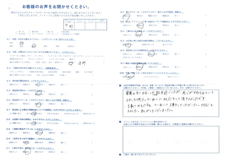 お店の雰囲気や印象。または、営業(サービス)担当者や職人で印象に残った者がおりましたら、お聞かせください。その他、ご要望・ご意見などございましたら、ぜひ、お聞かせください。