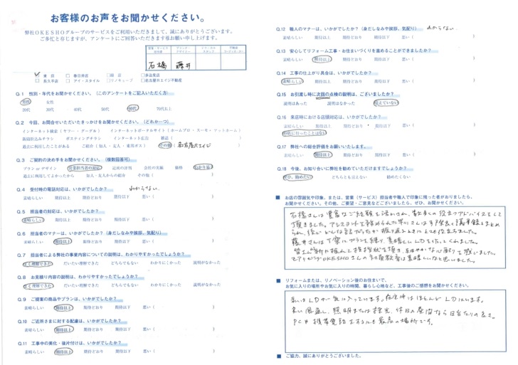 お店の雰囲気や印象。または、営業(サービス)担当者や職人で印象に残った者がおりましたら、お聞かせください。その他、ご要望・ご意見などございましたら、ぜひ、お聞かせください。