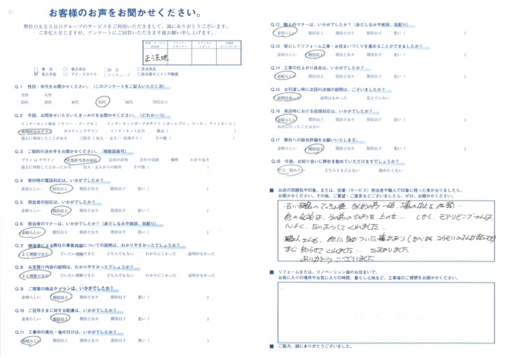 お店の雰囲気や印象。または、営業(サービス)担当者や職人で印象に残った者がおりましたら、お聞かせください。その他、ご要望・ご意見などございましたら、ぜひ、お聞かせください。