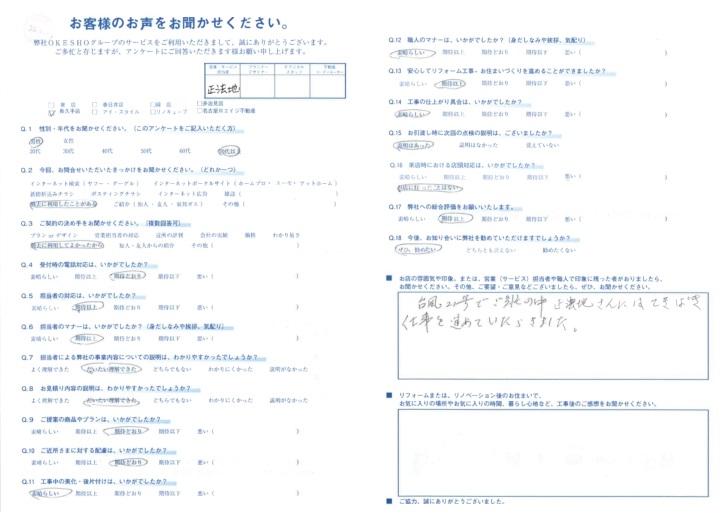 お店の雰囲気や印象。または、営業(サービス)担当者や職人で印象に残った者がおりましたら、お聞かせください。その他、ご要望・ご意見などございましたら、ぜひ、お聞かせください。