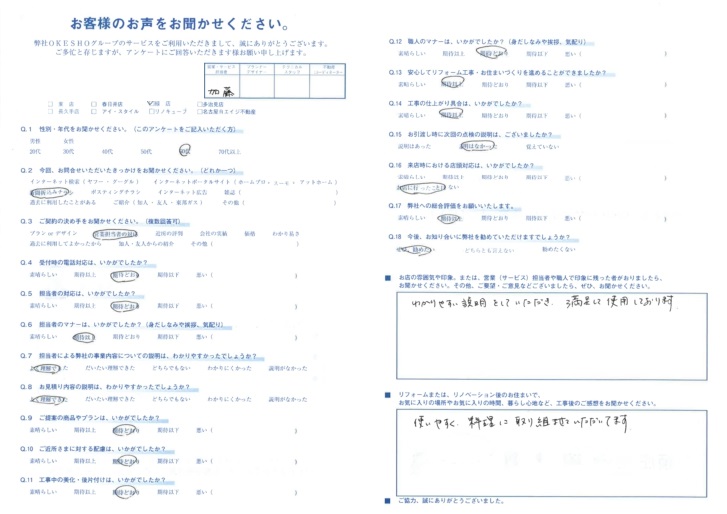 お店の雰囲気や印象。または、営業(サービス)担当者や職人で印象に残った者がおりましたら、お聞かせください。その他、ご要望・ご意見などございましたら、ぜひ、お聞かせください。