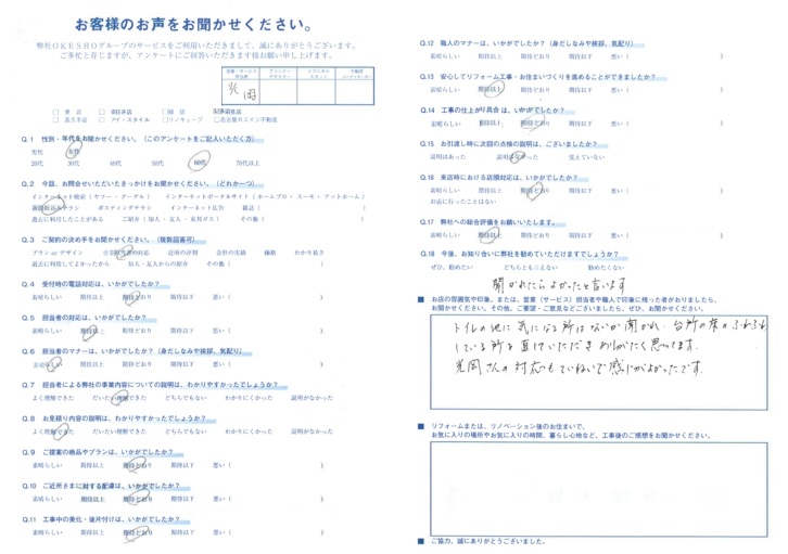 トイレの他に気になる所はないか聞かれ、台所の床のふわふわしている所を直していただき、ありがたく思ってます。