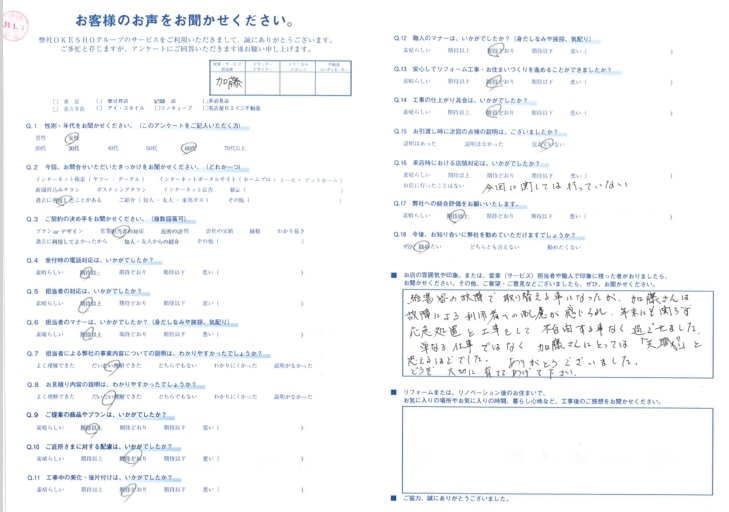給湯器の故障で取り替える事になったが、加藤さんは故障による利用者への配慮が感じられ、年末にも関わらず応急処置と工事をして 不自由する事なく過ごせました。