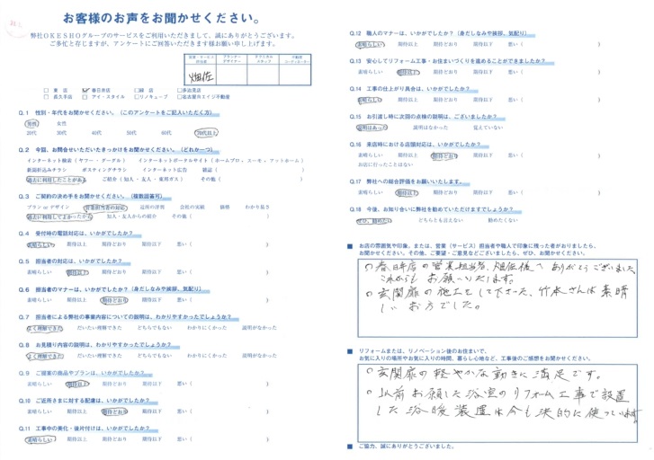 お店の雰囲気や印象。または、営業(サービス)担当者や職人で印象に残った者がおりましたら、お聞かせください。その他、ご要望・ご意見などございましたら、ぜひ、お聞かせください。