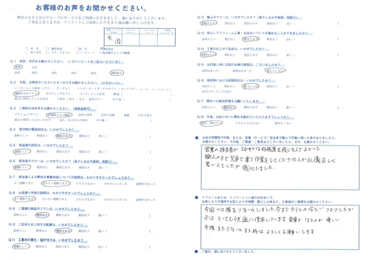 お店の雰囲気や印象。または、営業(サービス)担当者や職人で印象に残った者がおりましたら、お聞かせください。その他、ご要望・ご意見などございましたら、ぜひ、お聞かせください。