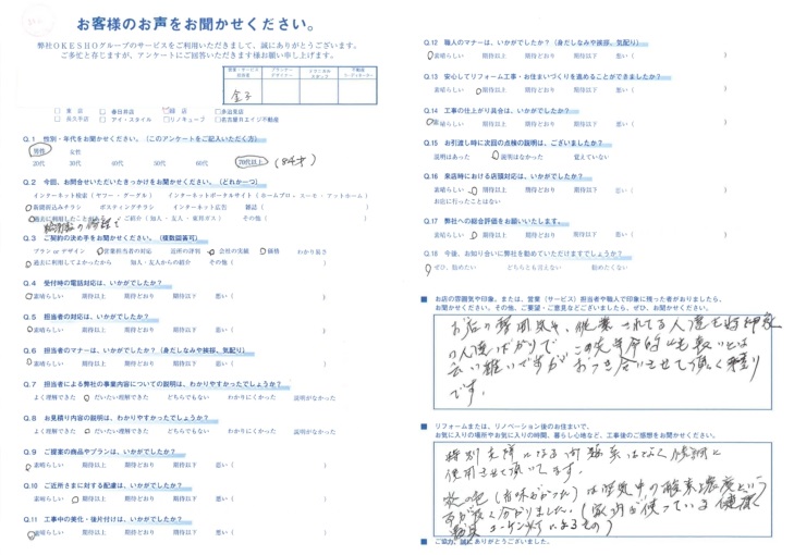 お店の雰囲気や印象。または、営業(サービス)担当者や職人で印象に残った者がおりましたら、お聞かせください。その他、ご要望・ご意見などございましたら、ぜひ、お聞かせください。