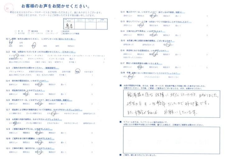 給湯器の急な故障に対応していただき助かりました。担当の方も一生懸命だったので好印象です。