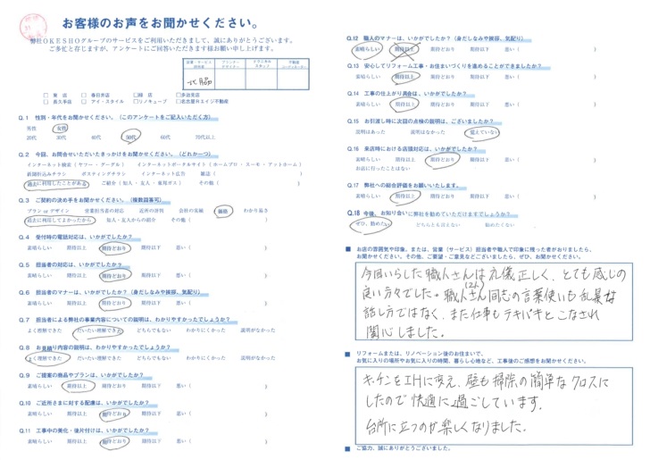 お店の雰囲気や印象。または、営業(サービス)担当者や職人で印象に残った者がおりましたら、お聞かせください。その他、ご要望・ご意見などございましたら、ぜひ、お聞かせください。