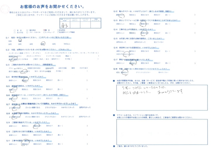 お店の雰囲気や印象。または、営業(サービス)担当者や職人で印象に残った者がおりましたら、お聞かせください。その他、ご要望・ご意見などございましたら、ぜひ、お聞かせください。