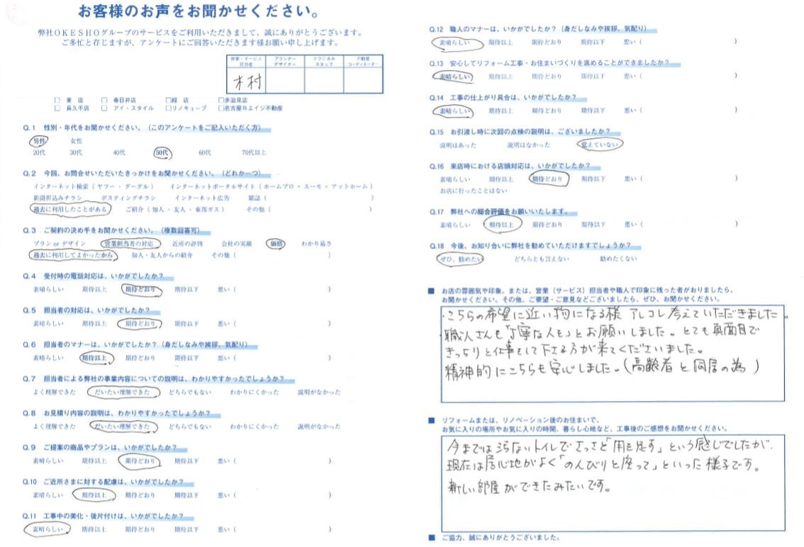 お店の雰囲気や印象。または、営業(サービス)担当者や職人で印象に残った者がおりましたら、お聞かせください。その他、ご要望・ご意見などございましたら、ぜひ、お聞かせください。