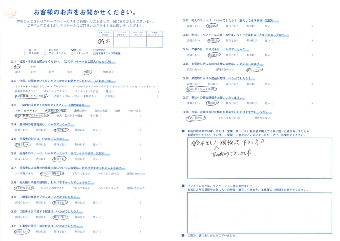 お店の雰囲気や印象。または、営業(サービス)担当者や職人で印象に残った者がおりましたら、お聞かせください。その他、ご要望・ご意見などございましたら、ぜひ、お聞かせください。