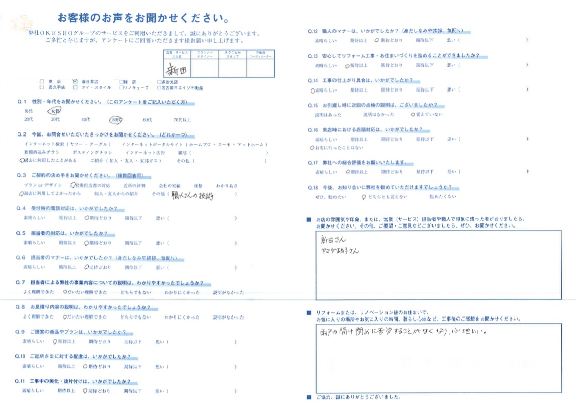 お店の雰囲気や印象。または、営業(サービス)担当者や職人で印象に残った者がおりましたら、お聞かせください。その他、ご要望・ご意見などございましたら、ぜひ、お聞かせください。