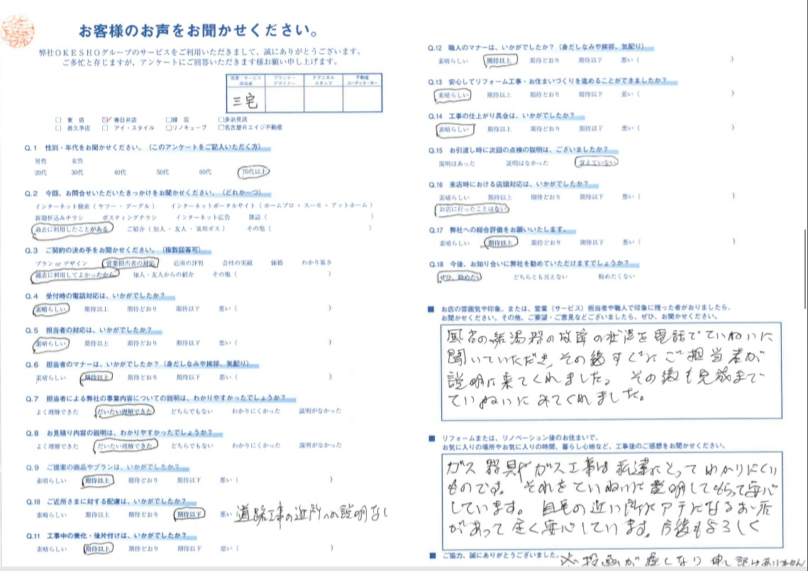 風呂の給湯器の故障の状況を電話でていねいに聞いていただき、その後すぐに ご担当者が説明に来てくれました。その後も完成までていねいにみてくれました。