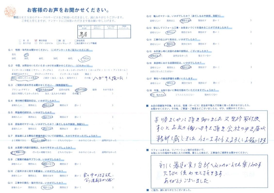 手順よくやって頂き助かりました。又、契約 取付後 すぐにお礼の御ハガキを頂き、会社のゆき届いた精神を感じました。小さい工事でも 又よろしくお願いします。