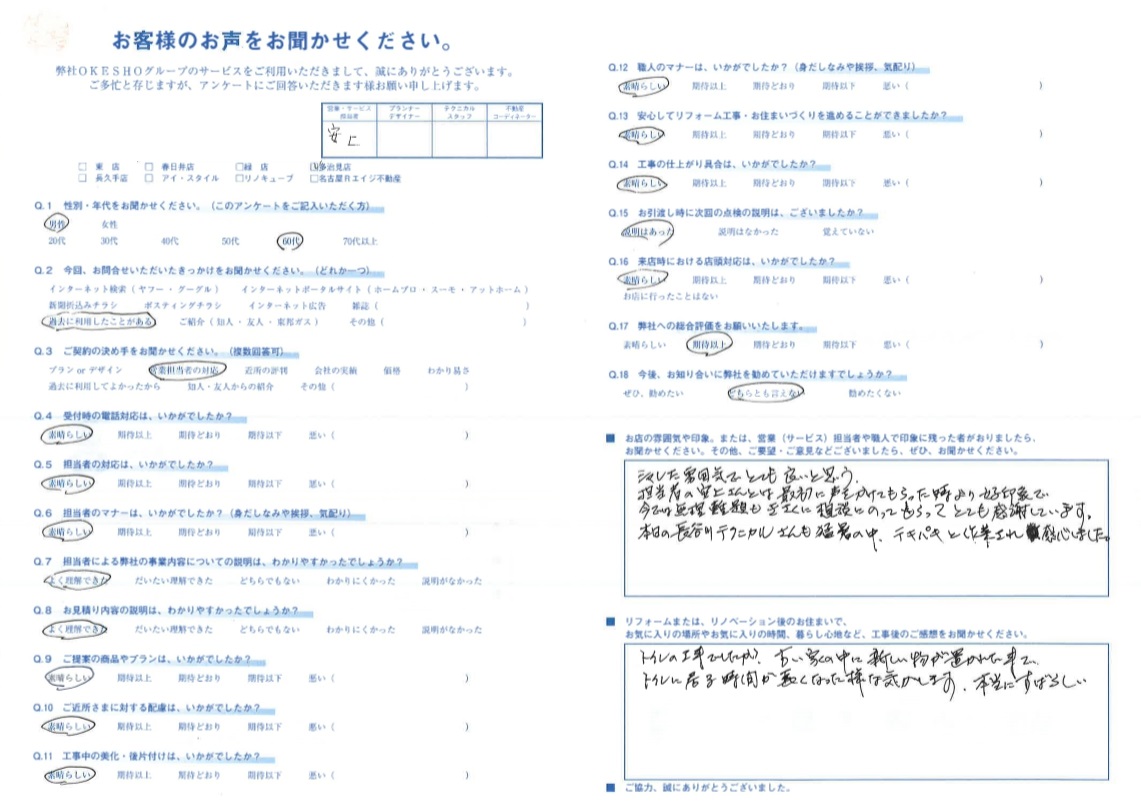 お店の雰囲気や印象。または、営業(サービス)担当者や職人で印象に残った者がおりましたら、お聞かせください。その他、ご要望・ご意見などございましたら、ぜひ、お聞かせください。