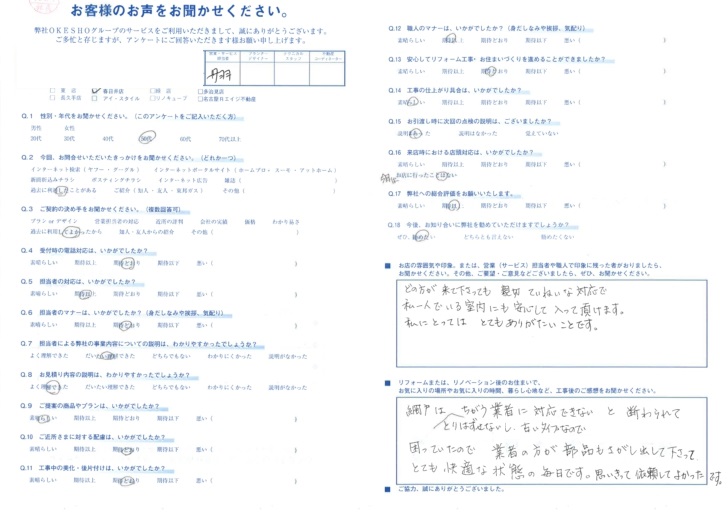お店の雰囲気や印象。または、営業(サービス)担当者や職人で印象に残った者がおりましたら、お聞かせください。その他、ご要望・ご意見などございましたら、ぜひ、お聞かせください。