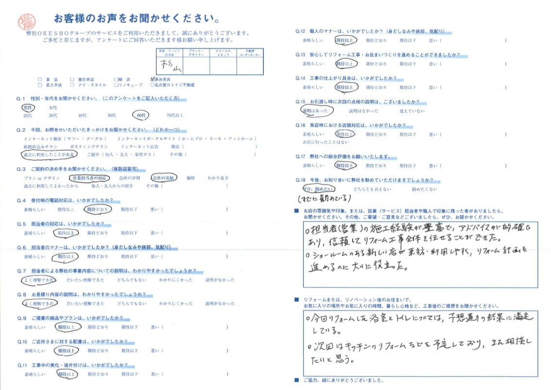 ○今回リフォームした浴室とトイレについては、予想通りの結果に満足している。