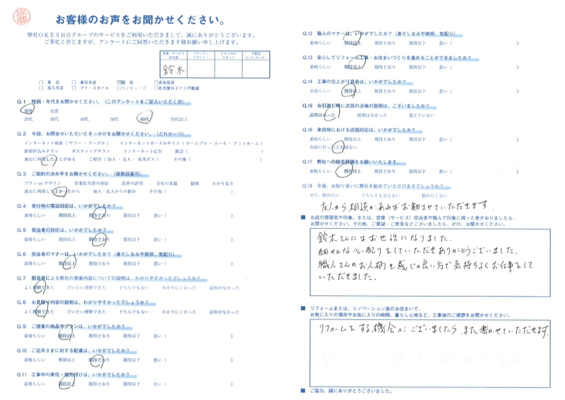 お店の雰囲気や印象。または、営業(サービス)担当者や職人で印象に残った者がおりましたら、お聞かせください。その他、ご要望・ご意見などございましたら、ぜひ、お聞かせください。