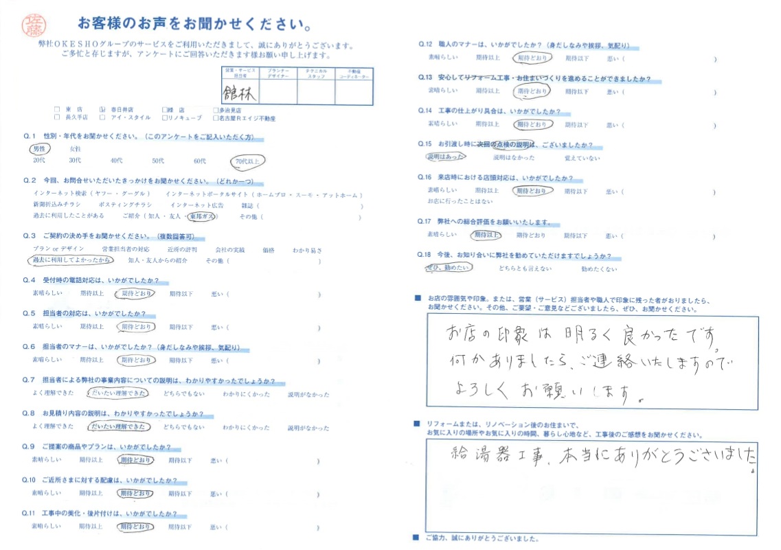 お店の雰囲気や印象。または、営業(サービス)担当者や職人で印象に残った者がおりましたら、お聞かせください。その他、ご要望・ご意見などございましたら、ぜひ、お聞かせください。