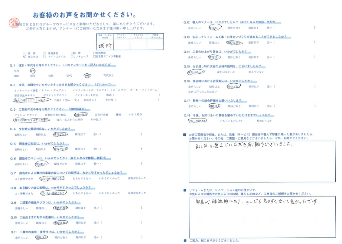 部屋が開放的になり、テレビも見やすくなって良かったです。