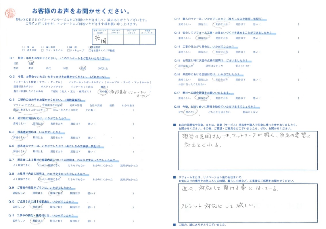 お店の雰囲気や印象。または、営業(サービス)担当者や職人で印象に残った者がおりましたら、お聞かせください。その他、ご要望・ご意見などございましたら、ぜひ、お聞かせください。