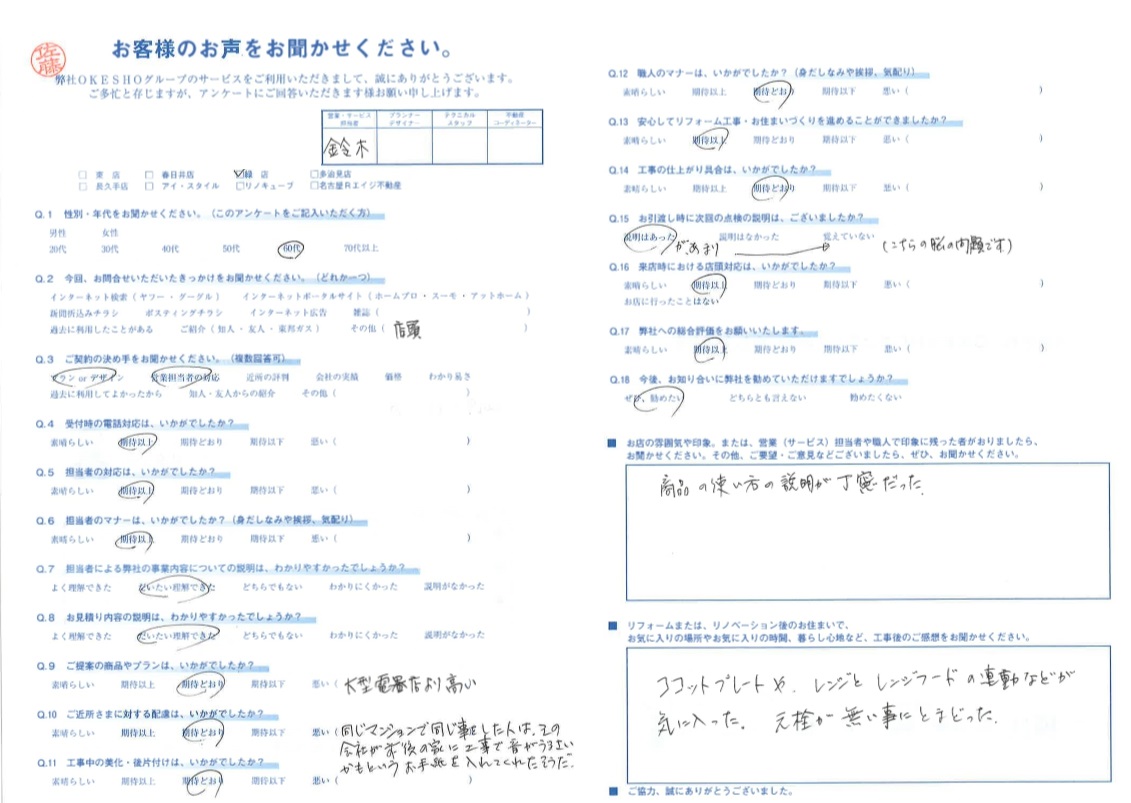 お店の雰囲気や印象。または、営業(サービス)担当者や職人で印象に残った者がおりましたら、お聞かせください。その他、ご要望・ご意見などございましたら、ぜひ、お聞かせください。