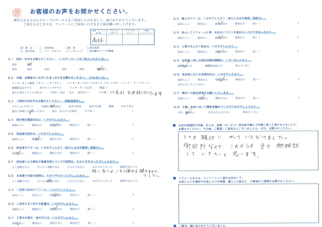 お店の雰囲気や印象。または、営業(サービス)担当者や職人で印象に残った者がおりましたら、お聞かせください。その他、ご要望・ご意見などございましたら、ぜひ、お聞かせください。
