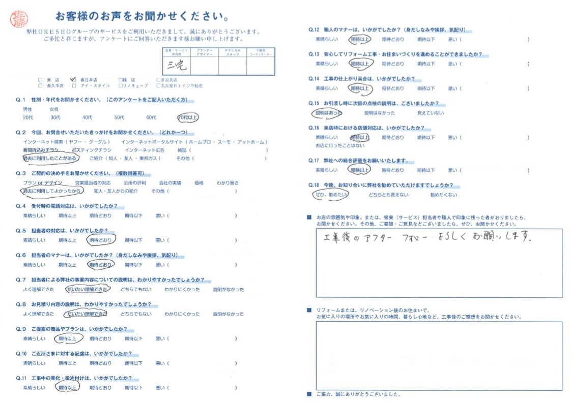 お店の雰囲気や印象。または、営業(サービス)担当者や職人で印象に残った者がおりましたら、お聞かせください。その他、ご要望・ご意見などございましたら、ぜひ、お聞かせください。
