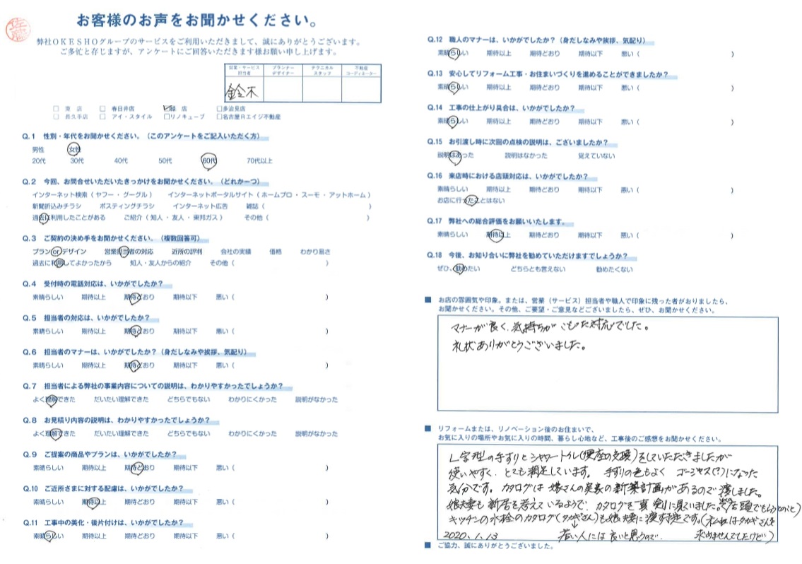 L字型の手すりとシャワートイレ(便座の交換)をしていただきましたが、使いやすく とても満足しています。手すりの色もよく ゴージャス(?)になった気分です。カタログは嫁さんの実家の新築計画があるので渡しました。