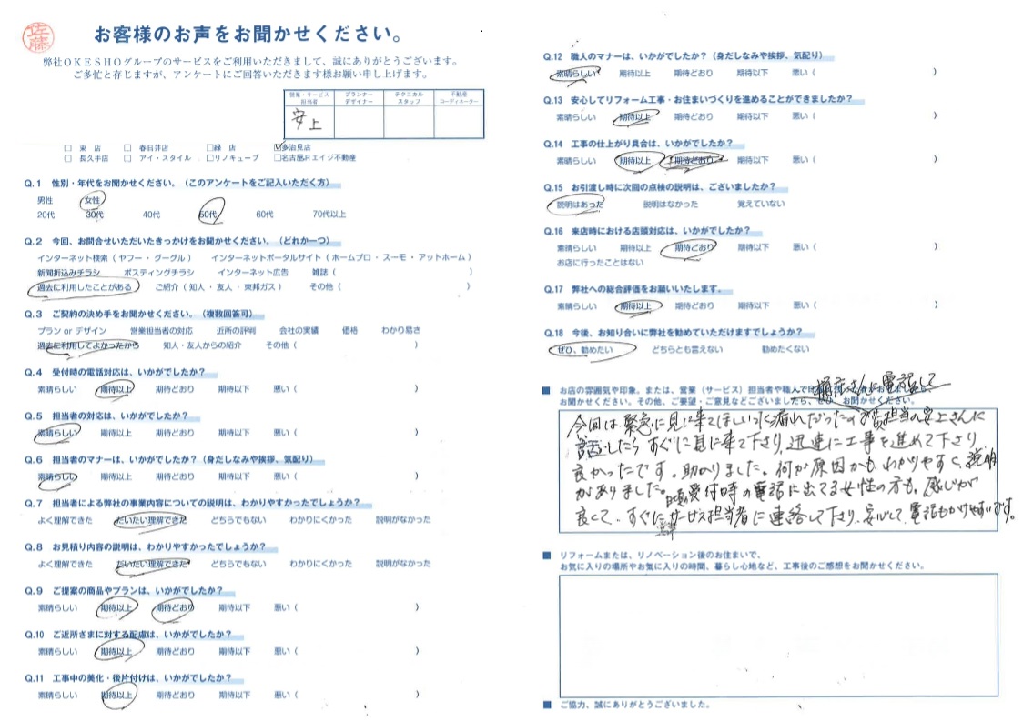 今回は緊急に見に来てほしい水漏れだったので、桶庄さんに電話して サービス担当の安上さんに話したら すぐに見に来て下さり、迅速に工事を進めて下さり 良かったです。助かりました。何が原因かも わかりやすく説明がありました。日頃の受付時の電話に出てる女性の方も 感じが良くて すぐにサービス担当に連絡して下さり、安心して電話もかけやすいです。