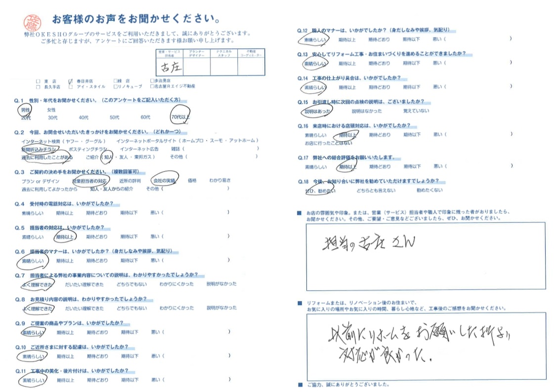 お店の雰囲気や印象。または、営業(サービス)担当者や職人で印象に残った者がおりましたら、お聞かせください。その他、ご要望・ご意見などございましたら、ぜひ、お聞かせください。