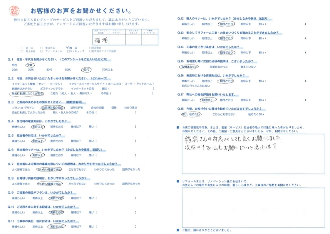 お店の雰囲気や印象。または、営業(サービス)担当者や職人で印象に残った者がおりましたら、お聞かせください。その他、ご要望・ご意見などございましたら、ぜひ、お聞かせください。