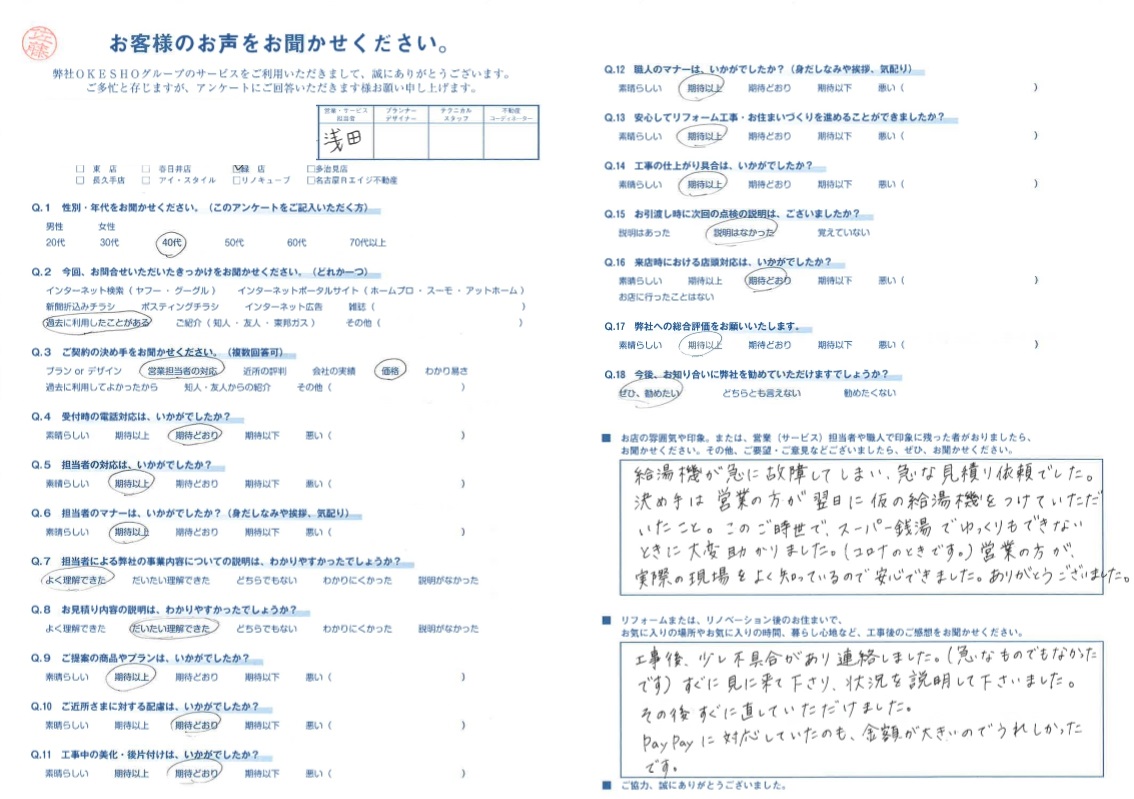 給湯器が急に故障してしまい、急な見積り依頼でした。決め手は営業の方が翌日に仮の給湯器をつけていただいたこと。このご時世で、スーパー銭湯でゆっくりもできないときに大変助かりました。(コロナのときです。)営業の方が、実際の現場をよく知っているので 安心できました。ありがとうございました。
