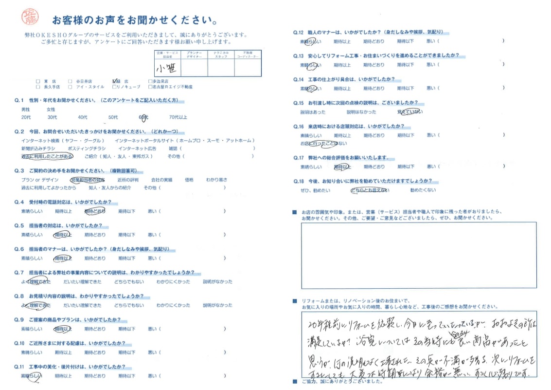 20年程前にリフォームを依頼し 今日に至っているが、おおよその所は満足しているが、浴室については その当時にも 今のより良い商品があったと思うが、何の説明もなく工事された。その点が不満が残る。次にリフォームをするにしても 大変な時期になり余裕が無い。すごく心残りです。