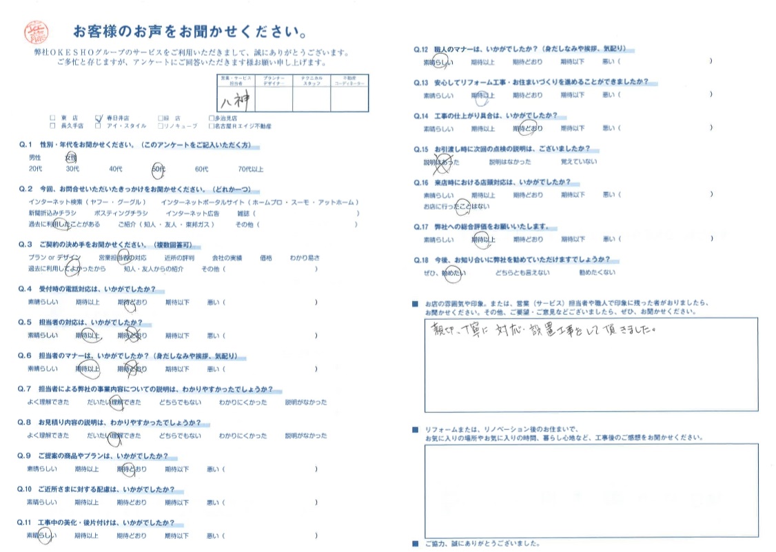 お店の雰囲気や印象。または、営業(サービス)担当者や職人で印象に残った者がおりましたら、お聞かせください。その他、ご要望・ご意見などございましたら、ぜひ、お聞かせください。