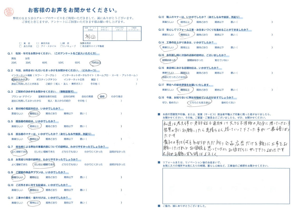 貴社の事は何もわからず ただ折り込み広告だけを頼りに工事をお願いしたけれど お値段も思っていたよりお値打ちにやって下さりよかったです。