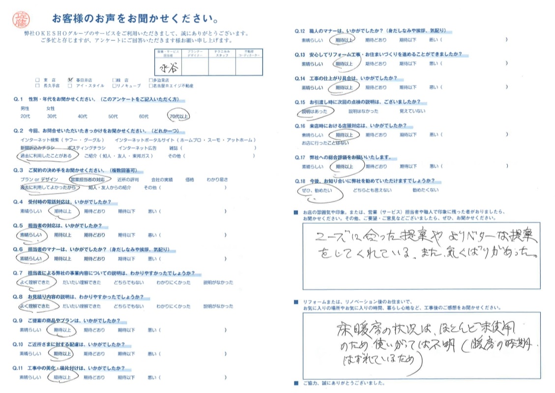 お店の雰囲気や印象。または、営業(サービス)担当者や職人で印象に残った者がおりましたら、お聞かせください。その他、ご要望・ご意見などございましたら、ぜひ、お聞かせください。