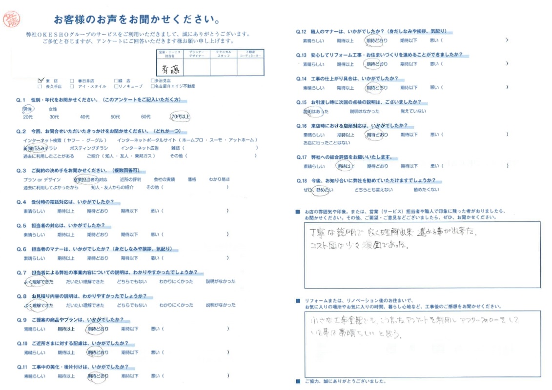 小さな工事金額でも こう言ったアンケートを利用しアフターフォローをしている事は素晴らしいと思う。