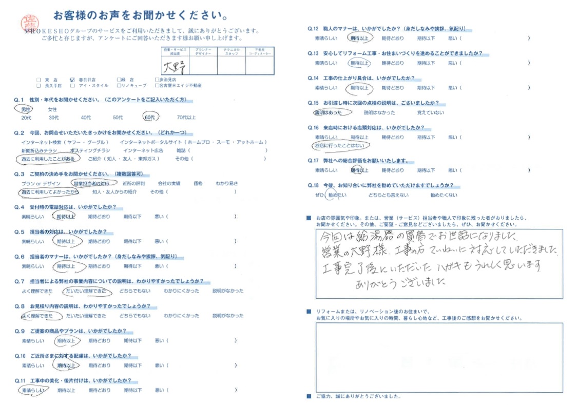 営業の大野様、工事の方 ていねいに対応していただきました。工事完了後にいただいた ハガキもうれしく思います。ありがとうございました。