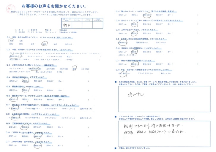 軽微なものであり特に感想はないが、担当者・職人の対応(マナー)は良かった。