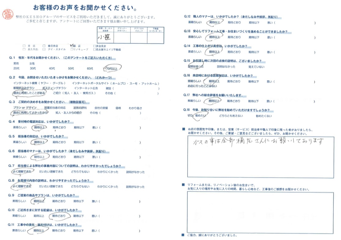 お店の雰囲気や印象。または、営業(サービス)担当者や職人で印象に残った者がおりましたら、お聞かせください。その他、ご要望・ご意見などございましたら、ぜひ、お聞かせください。