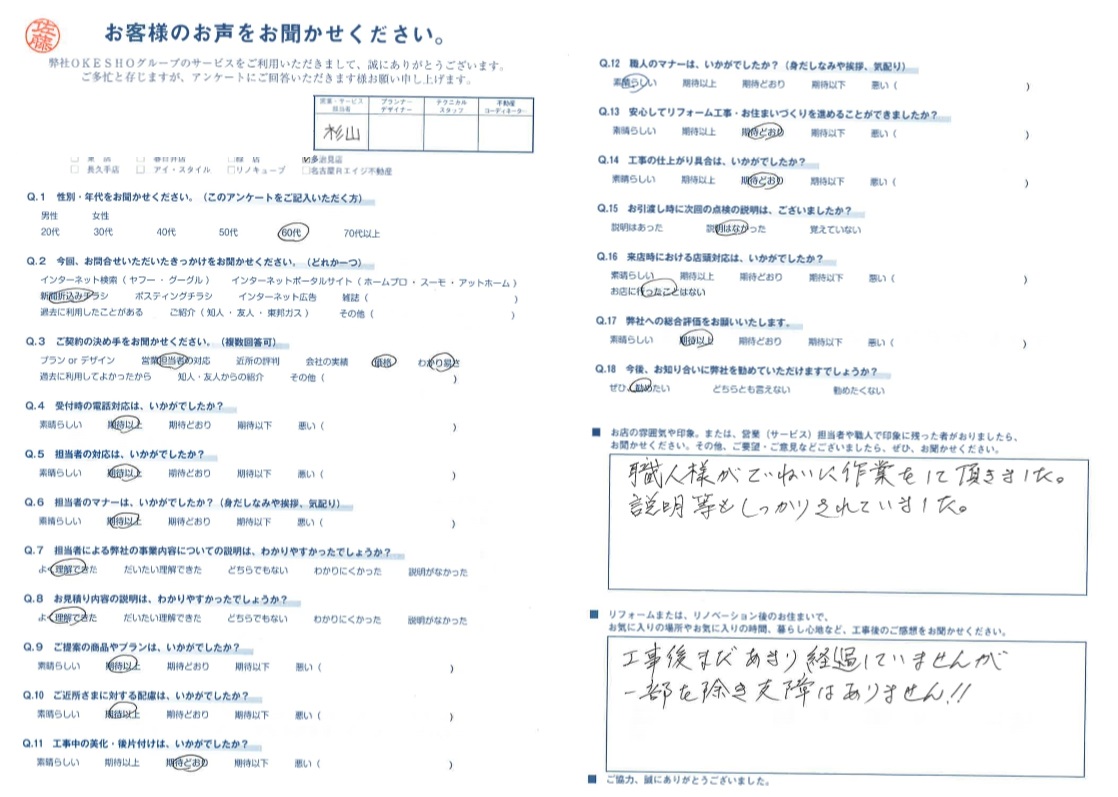 お店の雰囲気や印象。または、営業(サービス)担当者や職人で印象に残った者がおりましたら、お聞かせください。その他、ご要望・ご意見などございましたら、ぜひ、お聞かせください。