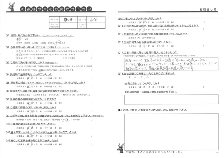 また担当の職人さんのテキパキとした仕事ぶりも無駄なくテキパキとしていて気持ちが良かった。貴社の社員教育の成果に感心です。