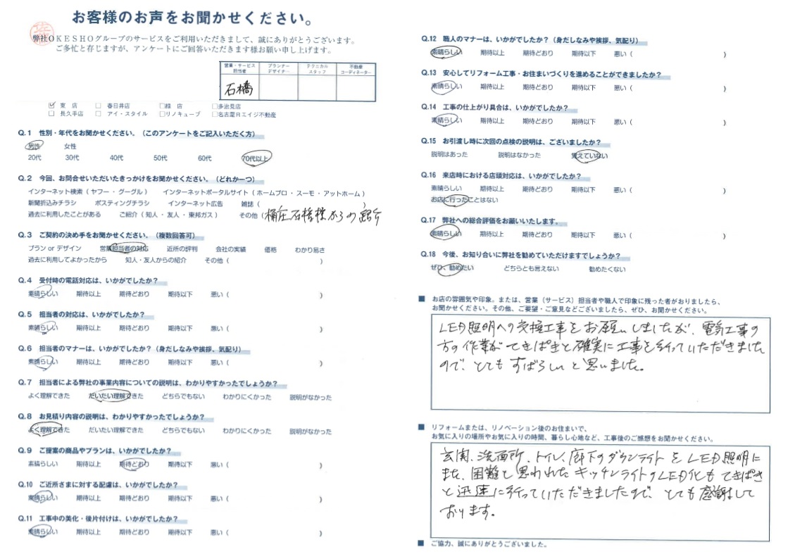 玄関・洗面所・トイレ・廊下のダウンライトをLED照明に、また 困難と思われたキッチンライトのLED化もてきぱきと迅速に行っていただきましたので、とても感謝しております。