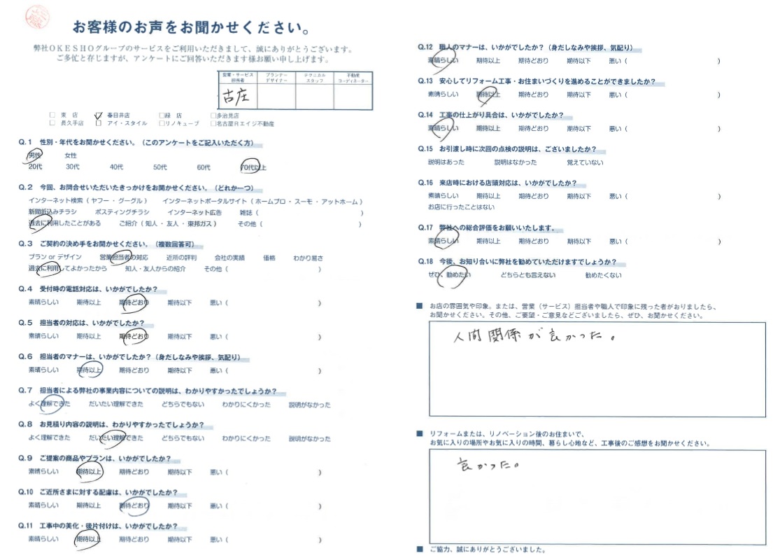 お店の雰囲気や印象。または、営業(サービス)担当者や職人で印象に残った者がおりましたら、お聞かせください。その他、ご要望・ご意見などございましたら、ぜひ、お聞かせください。