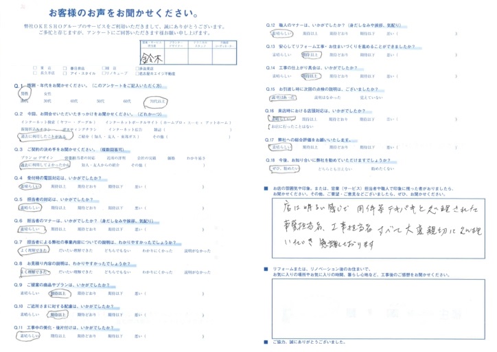 お店の雰囲気や印象。または、営業(サービス)担当者や職人で印象に残った者がおりましたら、お聞かせください。その他、ご要望・ご意見などございましたら、ぜひ、お聞かせください。